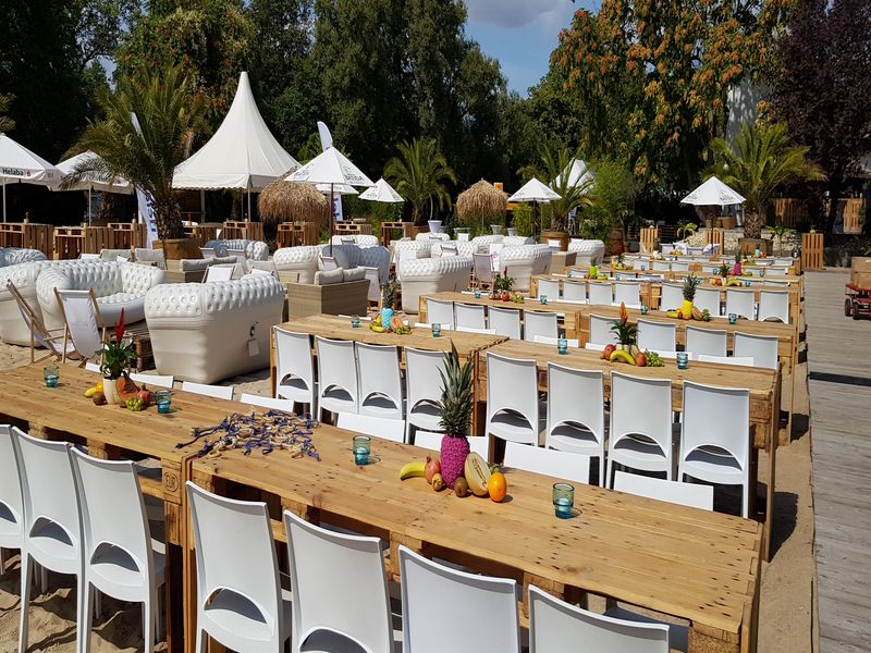 AbgelaufenIn diesem Jahr hatten alle unserer Kunden Glück, die ein großes Sommerfest vorwiegend im Freien geplant haben, denn das Wetter spielte zu 100% mit. So freuten wir uns auch mit unserem Kunden Helaba über eine tolle Stimmung in perfekter Beach-Club-Atmosphäre